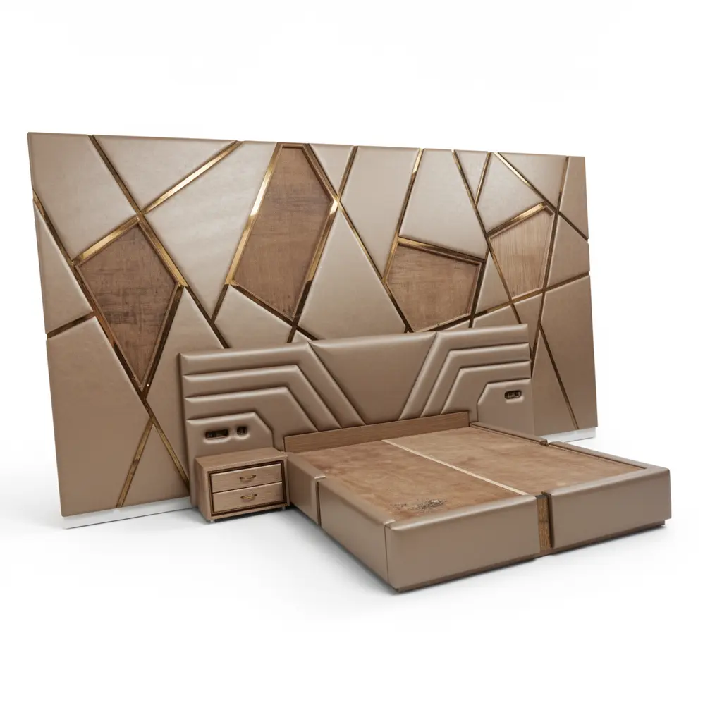 - Integrated Mosaic Wall Panel:Massive secondary headboard featuring a geometric mix of upholstery, wood grain, and gold-tone dividers.