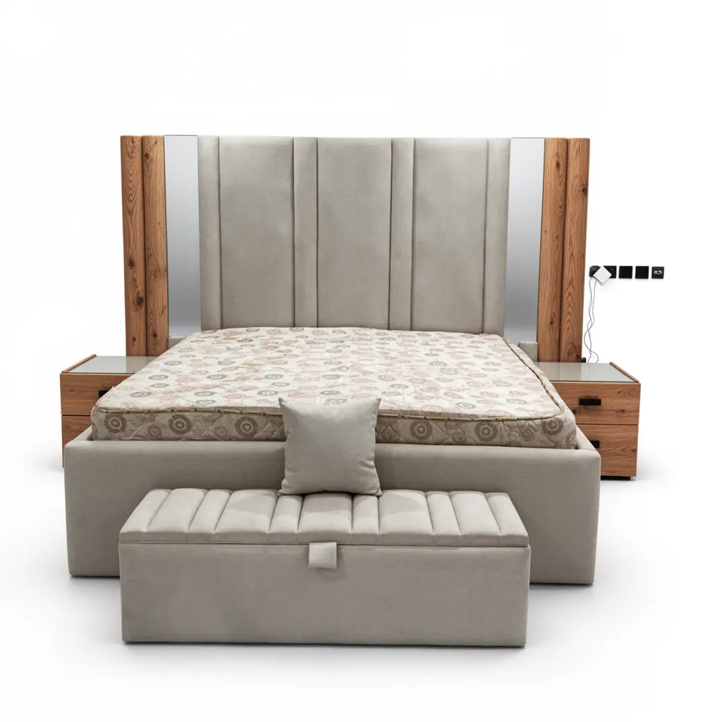 - Mirror & Wood Headboard Framing: The vertical channeled headboard is bordered by natural wood-grain accents and reflective mirror inlays.