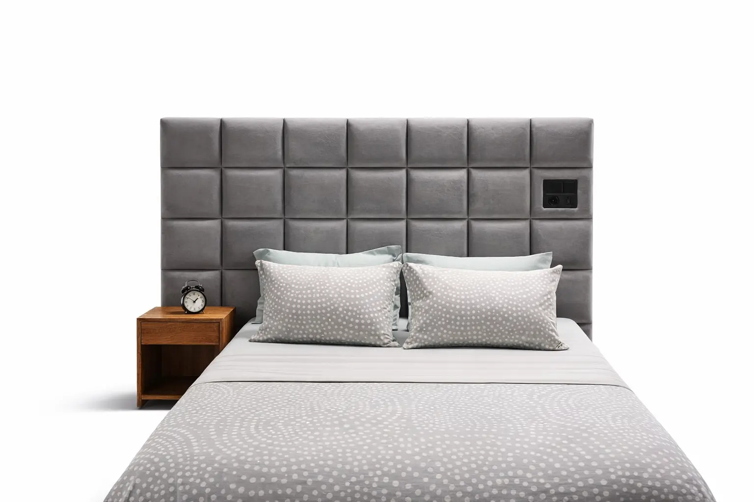 The standout feature is the oversized headboard, which uses a deep square-tufted "biscuit" pattern to provide a comfortable surface for sitting up and reading. For ultimate convenience, the headboard features an integrated electrical panel with a built-in power outlet and light switch, perfect for charging your devices overnight without messy wires across the floor. A matching natural oak nightstand with a clean open-shelf design provides a warm, organic contrast to the cool grey upholstery.