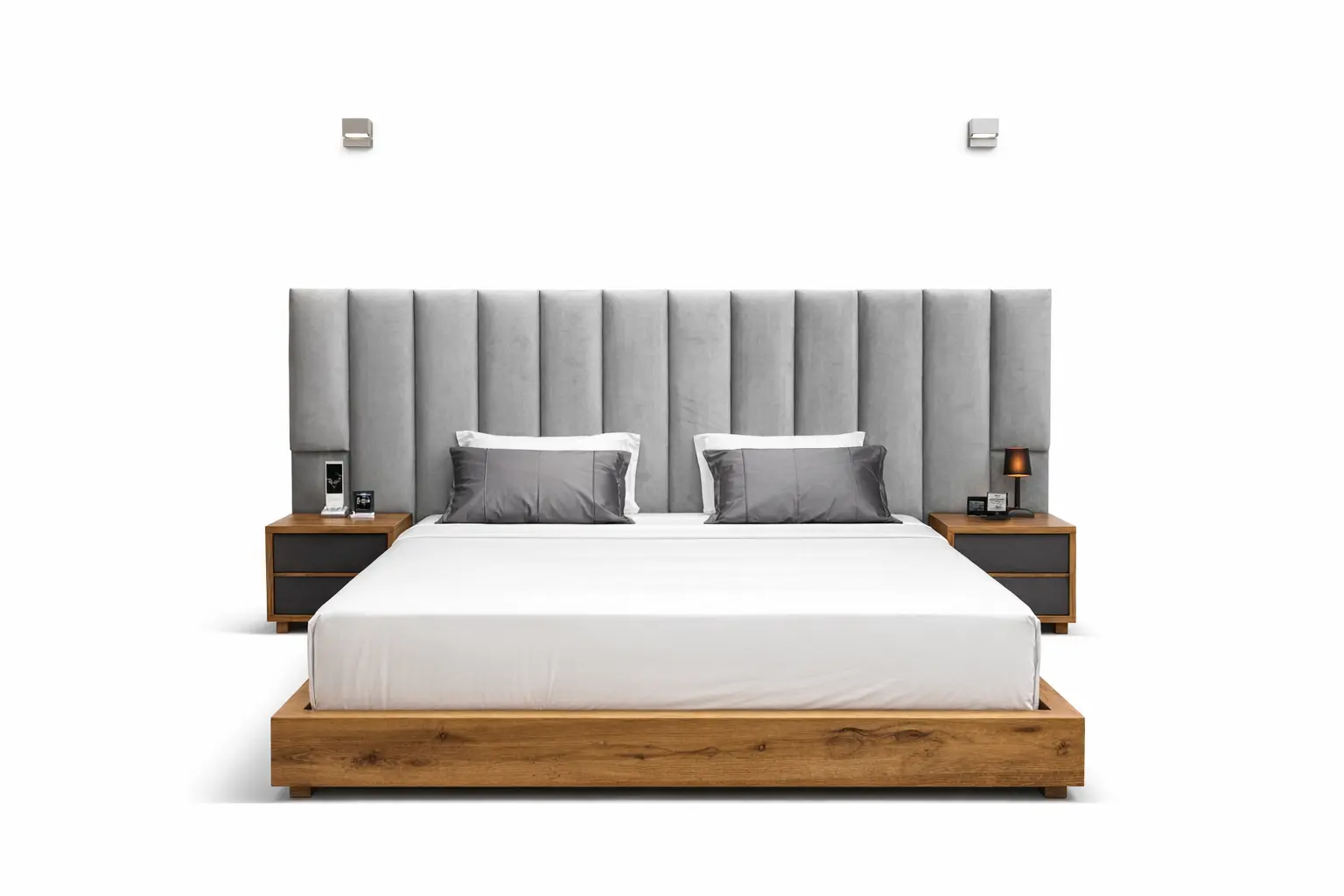 Modern Grey Velvet Bed with Oak Platform & Nightstands – Colombo